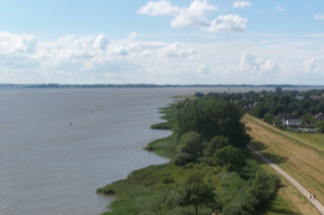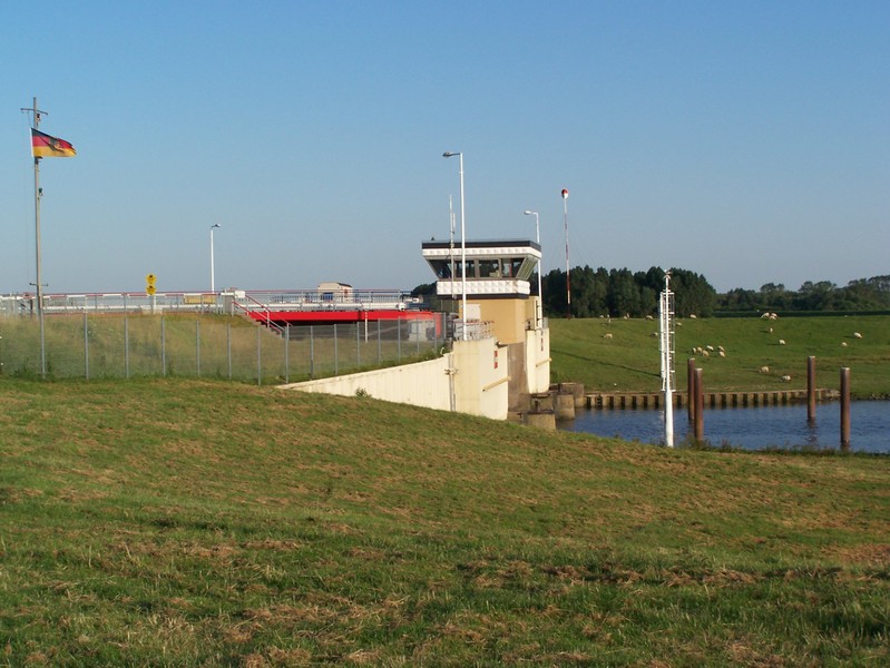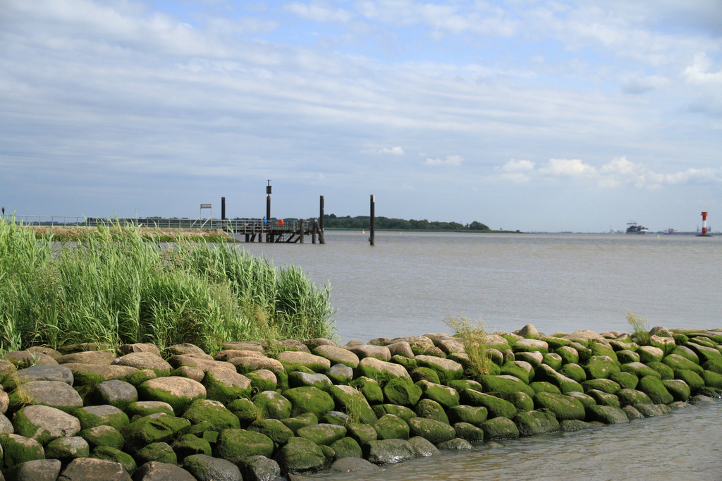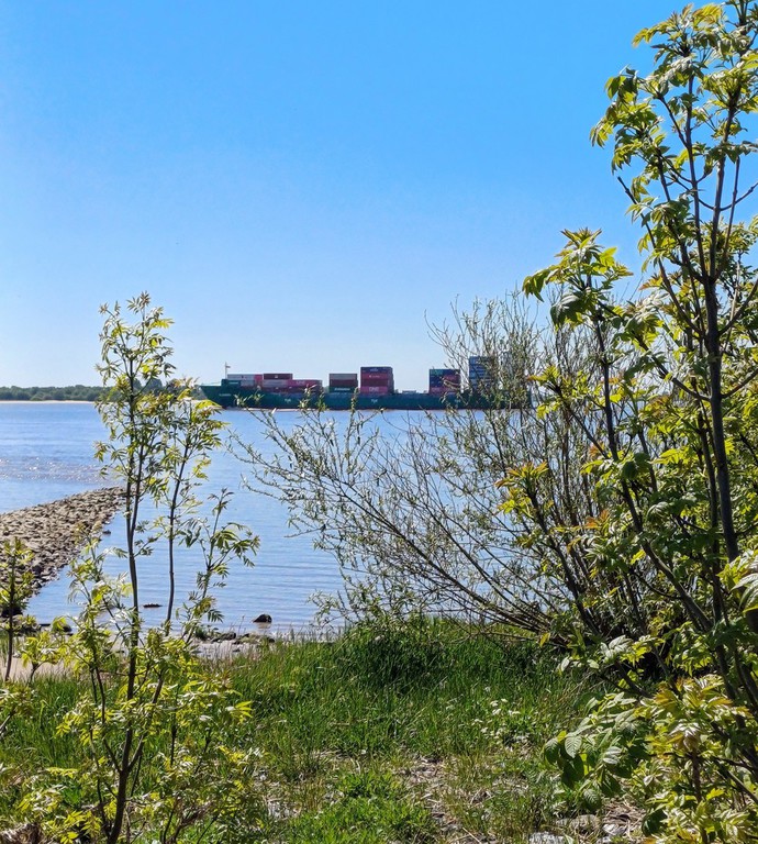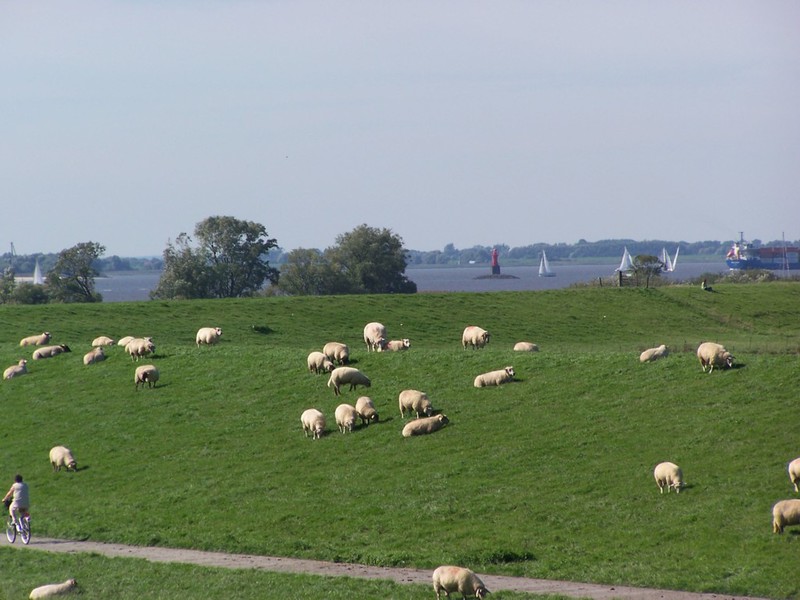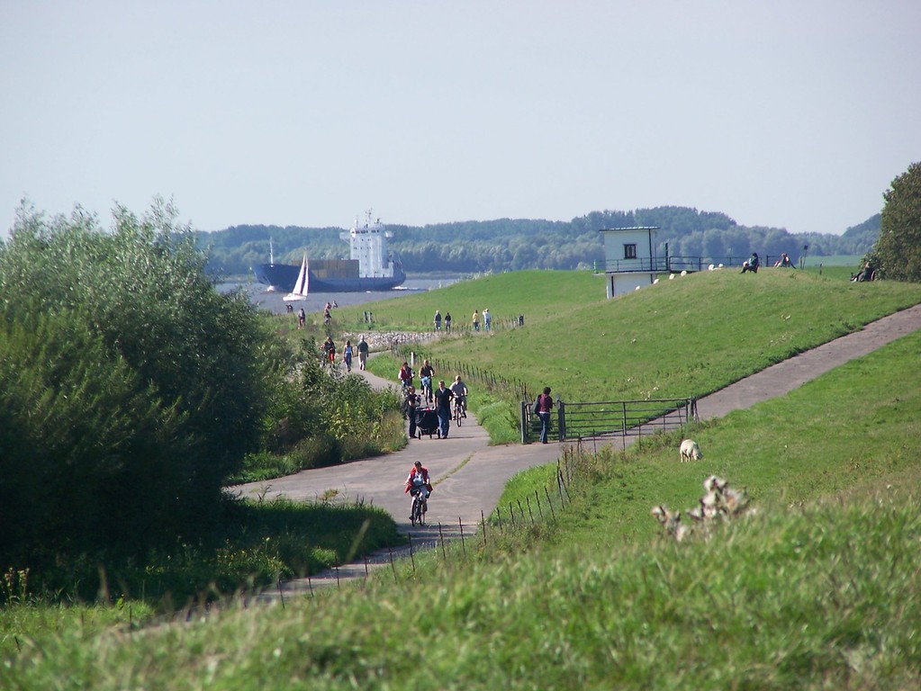Durch ein Gartentor gelangen Sie direkt auf den Deich. Hier weiden Lämmer und hier ist ein guter Platz zum „Schiffegucken“. Leichte Stühle stehen zur Verfügung. Der kleine Hafen ist in Sichtweite. Dort gibt es ein Restaurant mit Elbblick, ein Café und im Sommer Imbiss-Buden mit Fischbrötchen, Getränken usw. - und gratis dazu den spektakulären Ausblick auf den Elbstrom mit Schiffsverkehr von und nach Hamburg.
