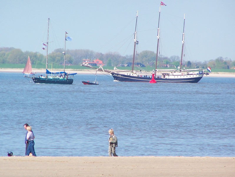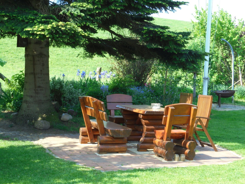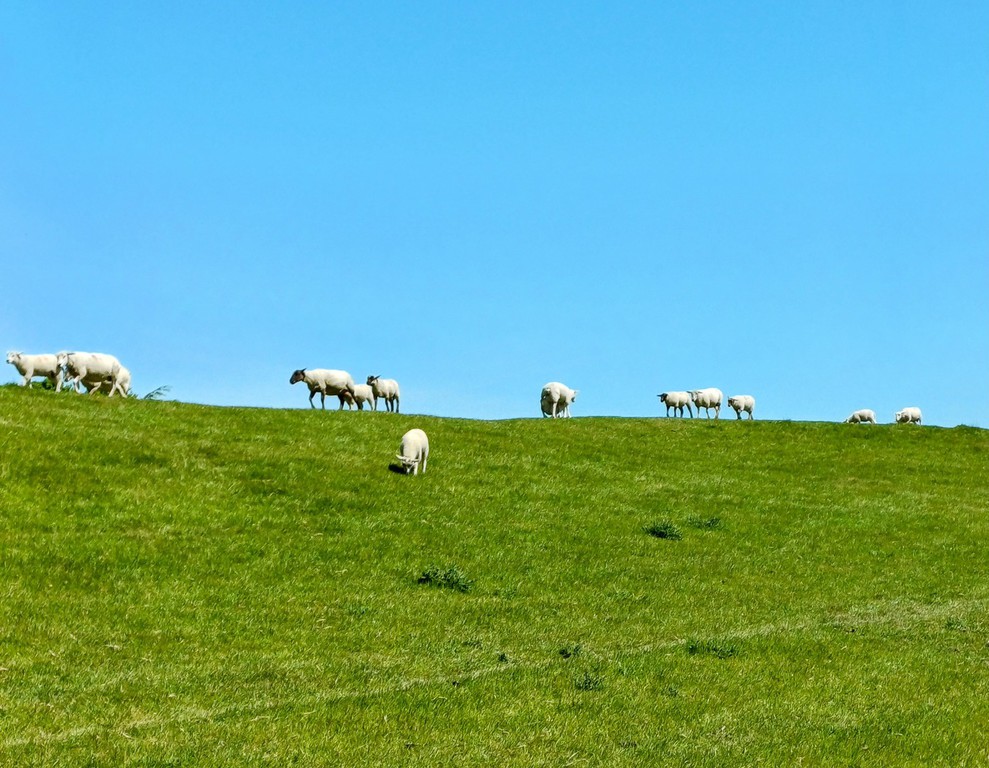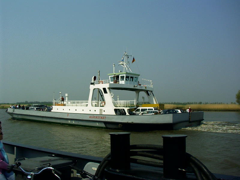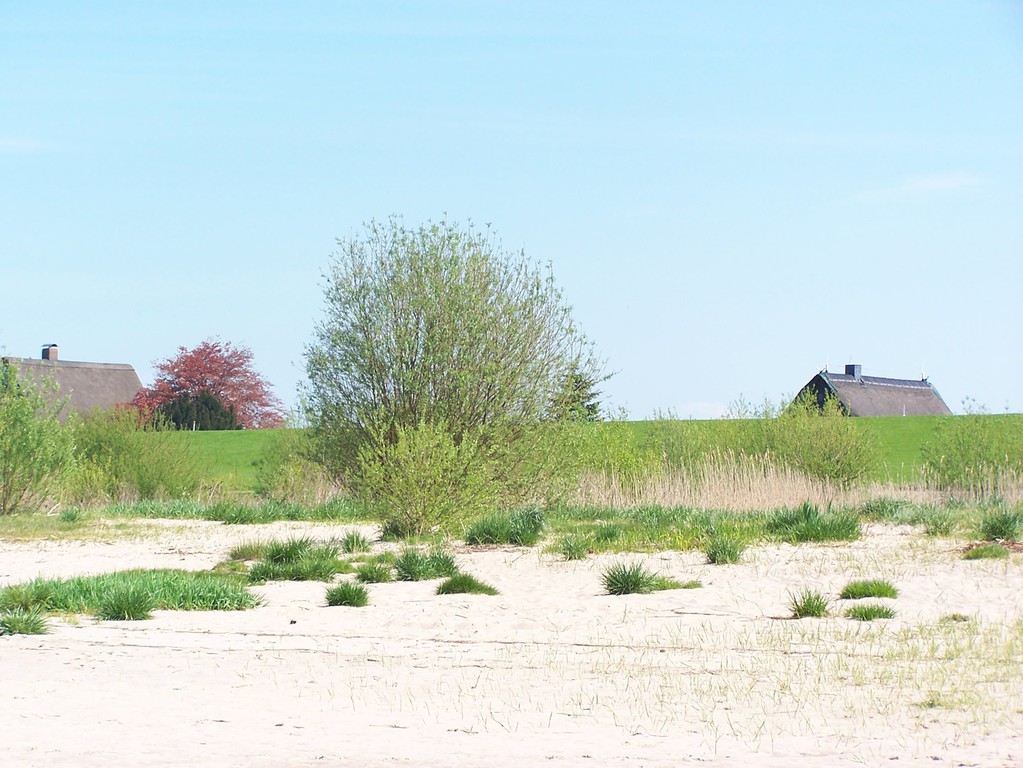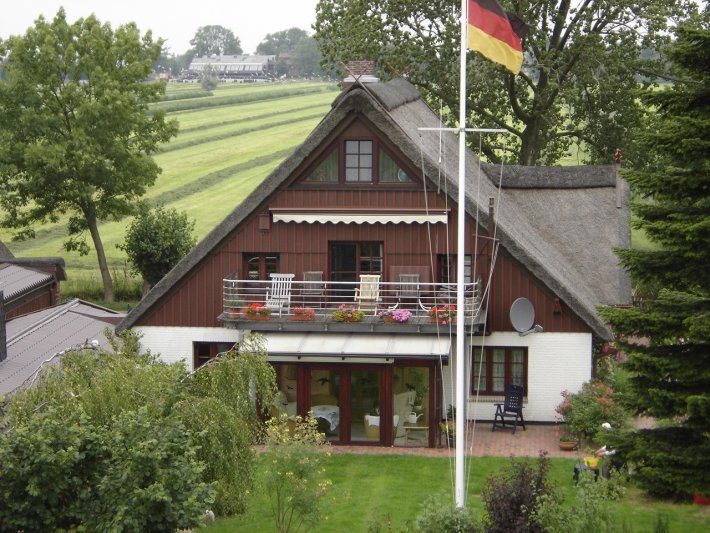 Durch ein Gartentor gelangen Sie direkt auf den Deich. Hier weiden Lämmer und hier ist ein guter Platz zum „Schiffegucken“. Leichte Stühle stehen zur Verfügung. Der kleine Hafen ist in Sichtweite. Dort gibt es ein Restaurant mit Elbblick, ein Café und im Sommer Imbiss-Buden mit Fischbrötchen, Getränken usw. - und gratis dazu den spektakulären Ausblick auf den Elbstrom mit Schiffsverkehr von und nach Hamburg.